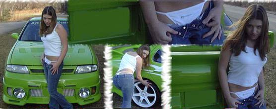 Who knows why she is posing with this car, but she sure does look good. Click thumbs for larger pics.
